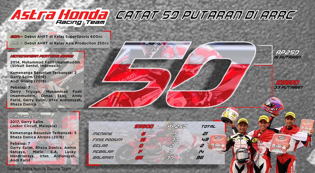 Astra Honda Racing Team akan menjalani putaran keempat ARRC 2019 di Suzuka Circuit pada akhir pekan ini dengan sudah menjalani total 48 putaran di kelas SuperSports 600cc dan Asia Production 250cc. Dengan dua kelas digelar pada akhir pekan ini, berarti tim Indonesia tersebut efektif akan merayakan putaran ke-50 di persaingan Asia yang perstisius. Tim mulai ikut persaingan ini pada 2014 dan sudah mencatat berbagai prestasi menjanjikan, termasuk dua gelar (kelas AP250) dan total 21 kemenangan di kelas AP250 dan SS600.
