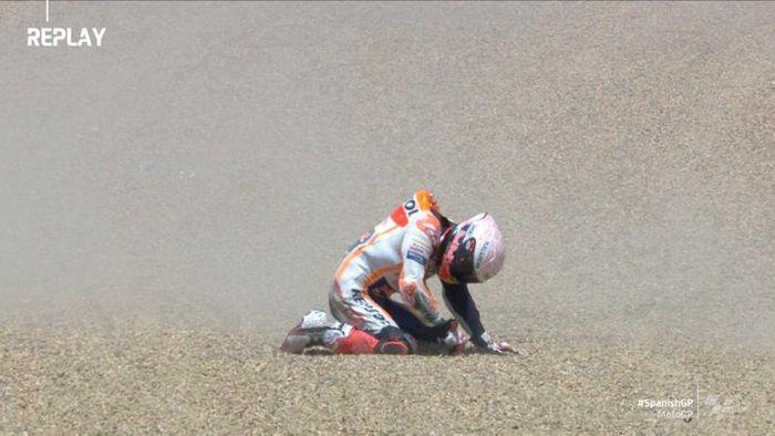Badan Marquez lalu mendarat di gravel dengan keras sebelum terhantam ban motor RC213V yang dia tunggangi.